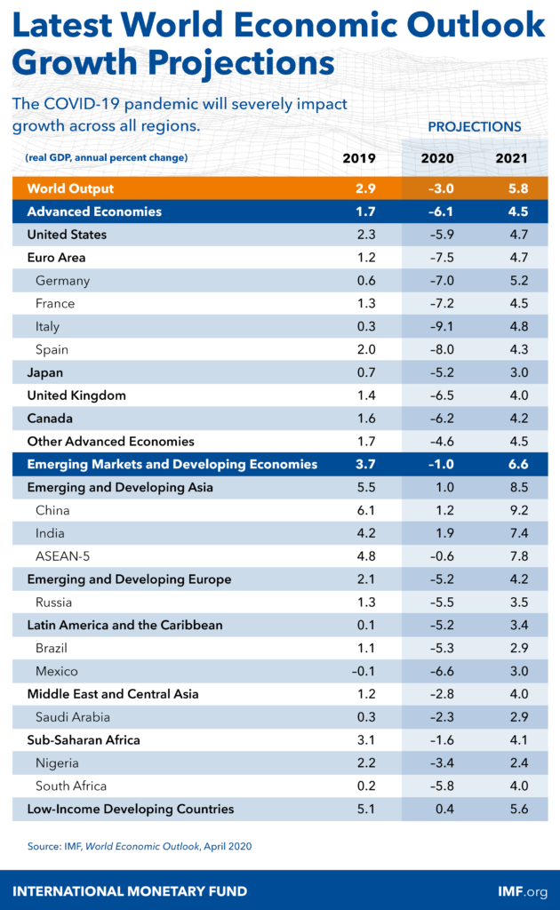 «Мы столкнулись с жестокой реальностью, в которой экспоненциальный рост инфекции означает, что 100 зараженных людей превращаются в 10 000 в течение нескольких дней», — отметила главный экономист МВФ Гита Гопинат в предисловии к докладу. «Очень вероятно, что в этом году мировая экономика испытает самую глубокую рецессию со времен Великой депрессии», — указала Гопинат.
