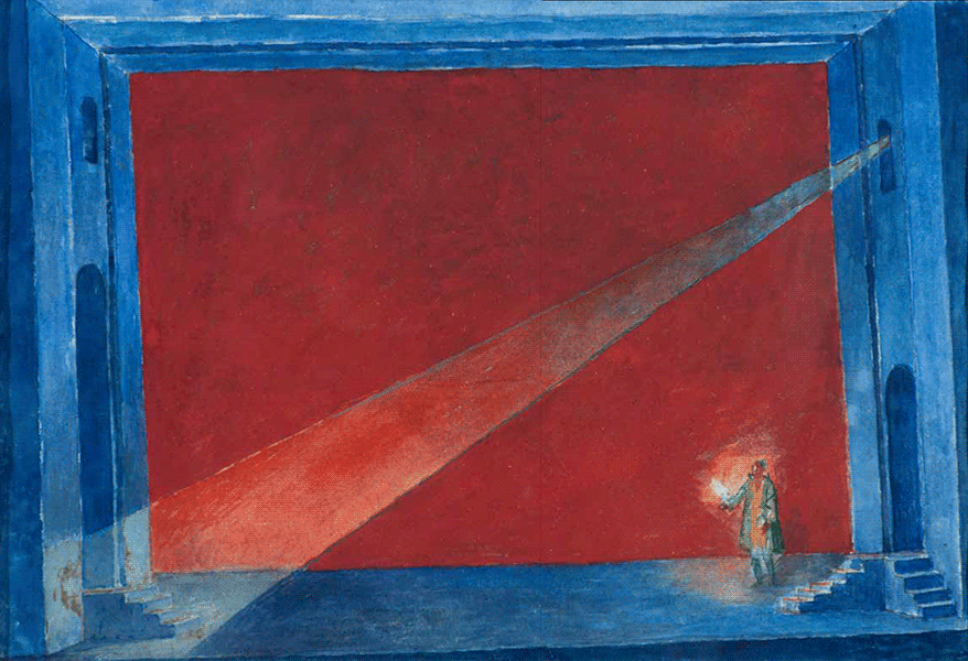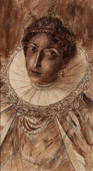 Мы видим и коллективные портреты, в которых бережно восстановлены фамилии бутафоров, гримеров, технических работников. И конечно, небывалые в своих творческих дерзаниях эскизы и пространственные образы выдающихся художников — Александра Бенуа, Мстислава Добужинского, Юрия Анненского, Бориса Кустодиева, Николая Акимова, Моисея Левина, Владимира Щуко. Когда на тебя смотрит поразительная «мраморная нимфа» Марина Мнишек в эскизе Кузьмы Петрова-Водкина, можно только горько вздохнуть о так никогда не появившемся на свет в 1928 году «Борисе Годунове». А заодно — воссоздать хотя бы в воображении образ театра, в репертуаре которого жили бы все эти не осуществленные по цензурным мотивам спектакли.