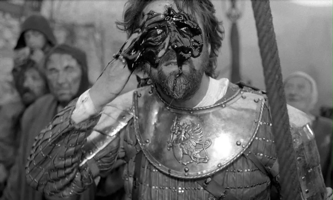 Удаление замысла от 1960-х немаловажно: третий сценарий Герман и Светлана Кармалита писали уже «по мотивам» повести братьев Стругацких, которым вообще везло с экранизациями поверх оригинального текста («Сталкер»). Германовская полифония и густая бытопись не просто перемололи «приключенческий» сюжет, но и вытравили остатки шестидесятнического идеализма, которые в сюжетах Стругацких уживались с наждачным представлением о мире и зубастостью персонажей. Потому и выбор цитируемого стихотворения так снайперски точен. Оказавшийся в вечно средневековом государстве Арканар земной ученый Румата (Леонид Ярмольник) все меньше верит в победу над «серыми» и серостью — и все больше в божественный огонь и обнуление.
