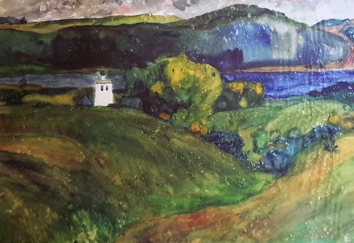 И чуть вошёл – ещё до портрета увидел в начале экспозиции откуда-то знакомые зеленые мокрые облака кустов, словно не написанных, а взлохмаченных кистью, как ветром, и долгие опять знакомые поля, как отражение неба. Откуда, откуда я знаю их? Подошел. Господи, Малы! Родная псковская деревня под Изборском – счастливая колония художников под крышей псковского реставратора и художника В. П. Смирнова, где я, как раз под крышей, нет-нет живал на чердаке. Овальное окно, оправленное в благородную старую раму, звалось «Четыре времени года». Оно выходило на озеро и дальний берег, и художник Господь вставлял в эту раму зимние небеса в звездах, золотые осени и кипящую зелень июней.
