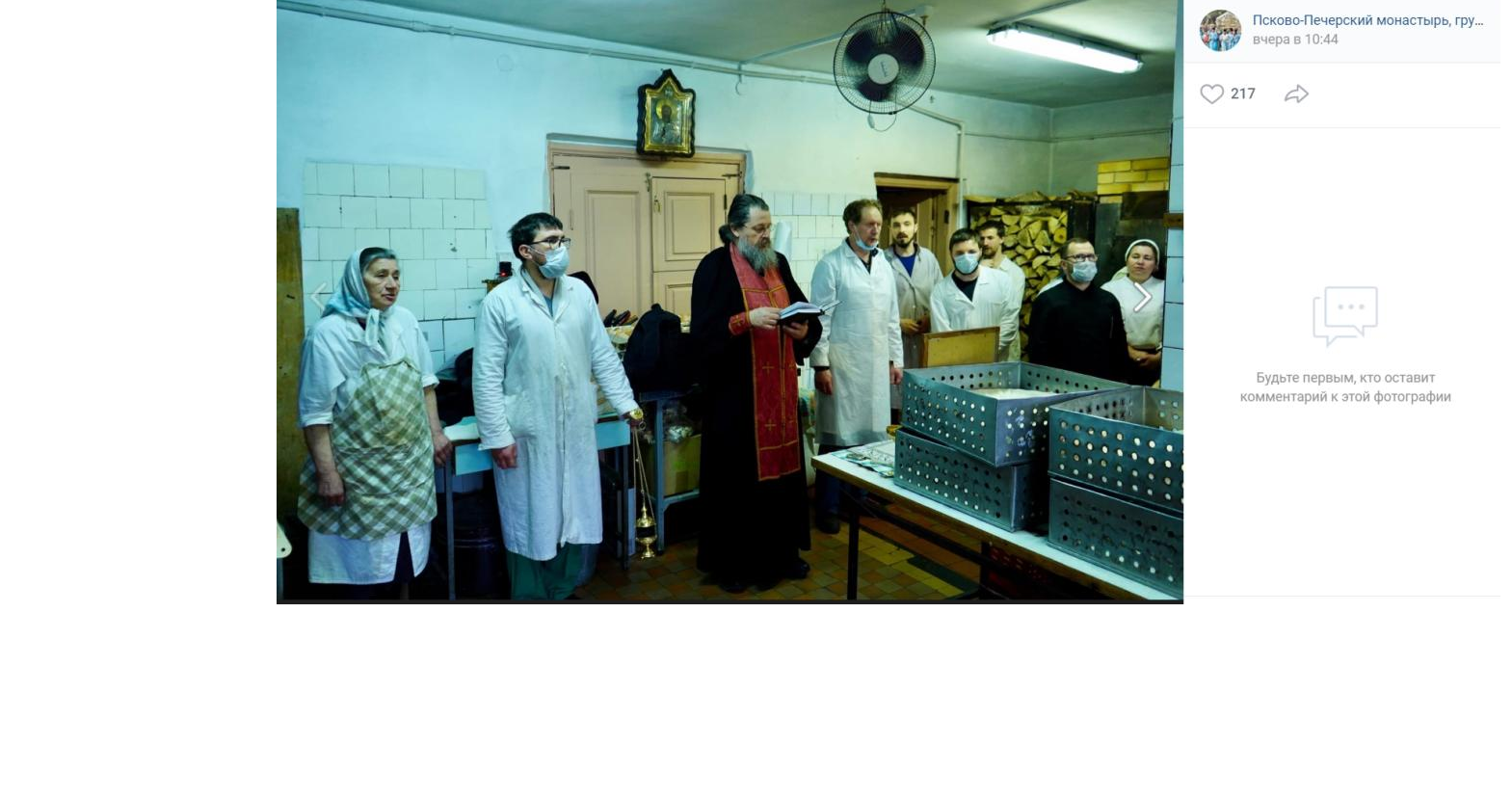 В Пскове сотрудники Свято-Успенского Псково-Печерского мужского монастыря пекут куличи без одноразовых масок и перчаток, не соблюдая дистанцию в 1,5 метра. Снимки подготовки к пасхе опубликовали в группе в социальной сети "ВКонтакте".