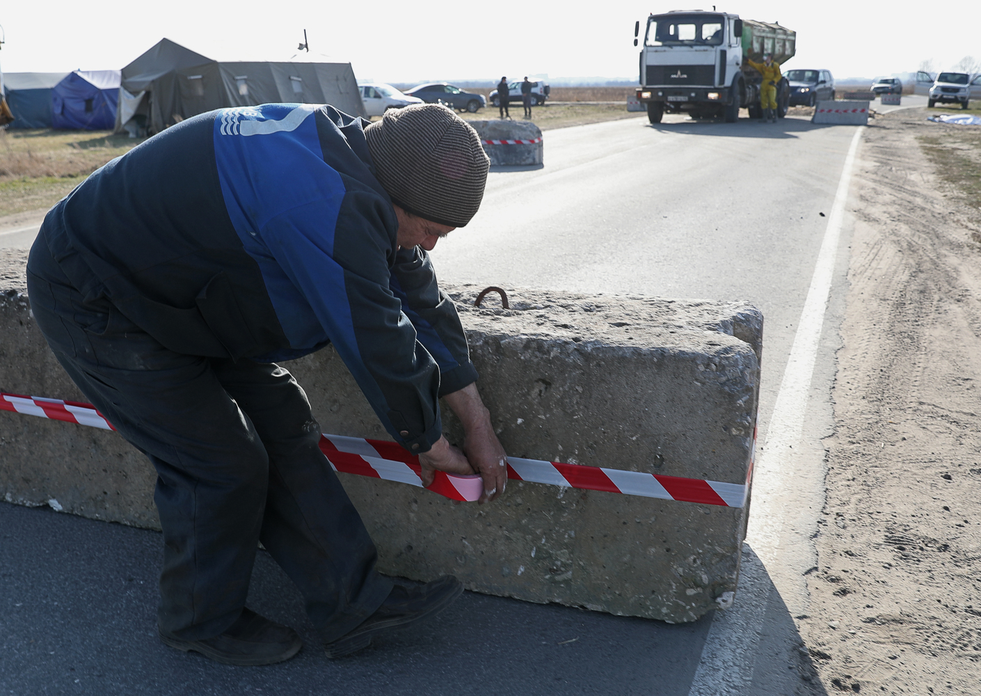 Установка бетонного заграждения на пропускном пункте на въезде в село Заокское. Фото: Александр Рюмин / ТАСС