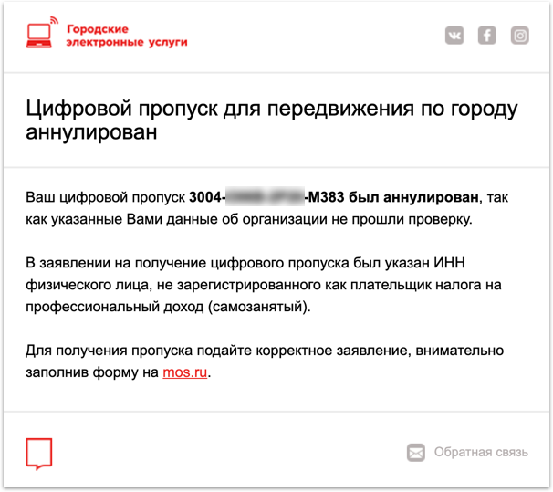 Отказы в мэрии объясняют тем, что данные для пропуска заполнены якобы некорректно. Индивидуальный предприниматель, юрист Денис Товкайло поделился с «Медузой» письмом об аннулировании пропуска.