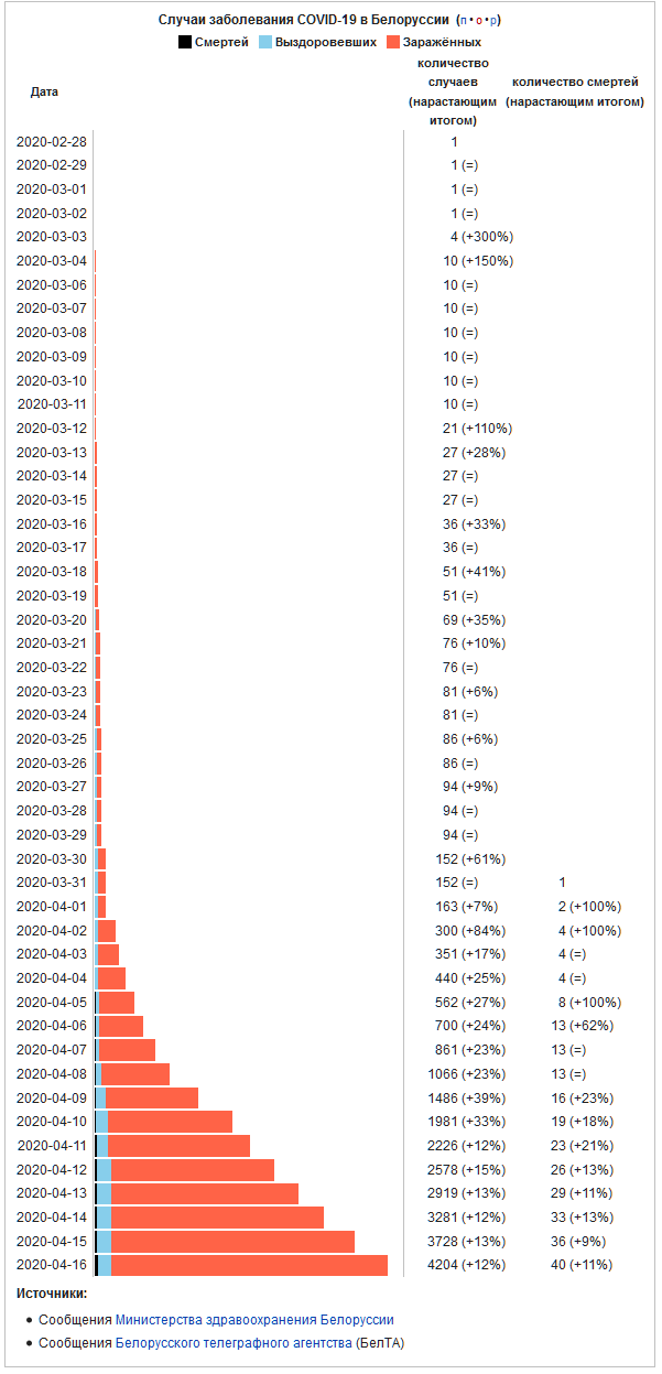 На 13 апреля, когда Лукашенко сделал свое заявление, в стране насчитывалось 29 случаев летального исхода от COVID-19. 16 апреля, через три дня после обещания президента, что никто от этой болезни не умрет, их стало уже 40.