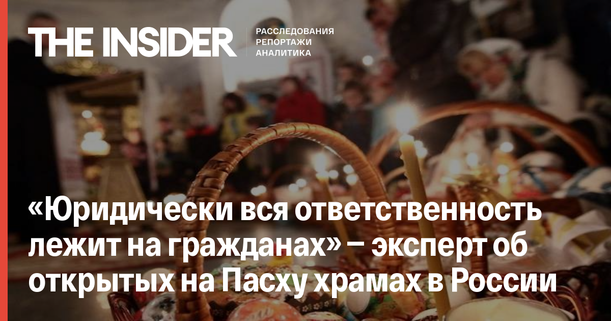 РПЦ рекомендует верующим оставаться дома. Юридически церкви должны подчиняться требованиям местных властей. По факту решения о формате служб принимают отдельные епархии. Как заявил в разговоре с The Insider старший партнер коллегии адвокатов Pen & Paper Валерий Зинченко, в итоге вся ответственность в любом случае ложится на граждан, а не на церковь.