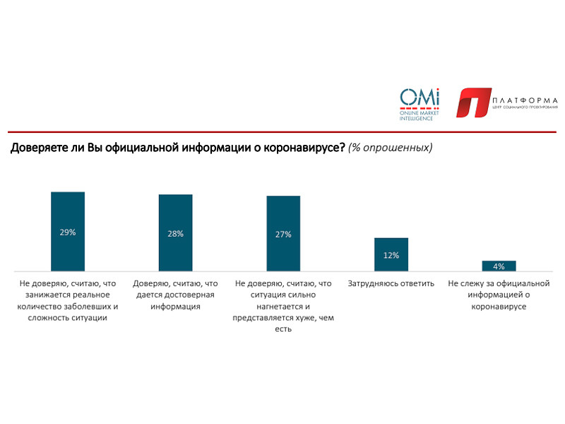 О недоверии к официальной информации заявили 56% респондентов. При этом причины, по которым россияне не верят официальной информации, разделились почти поровну: 29% считают, что власти занижают реальное количество заболевших и сложность ситуации, и почти столько же, напротив, уверены, что ситуация сильно нагнетается и представляется хуже, чем есть. 4% россиян заявили, что не следят за официальной информацией об эпидемии коронавируса.