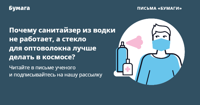 Во третьем выпуске рассылки химик Георгий Шахгильдян рассказывает о таких базовых химических вещах, как состав санитайзеров, а также о новых разработках в области наноматериалов — медицинских масках с ионами серебра и стекле для оптоволокна, которое производят в космосе.