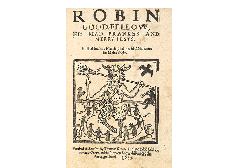 Хобгоблин в виде сатира на титульном листе издания «Робин Славный малый, его безумные проказы и смешные шутки» (1639)