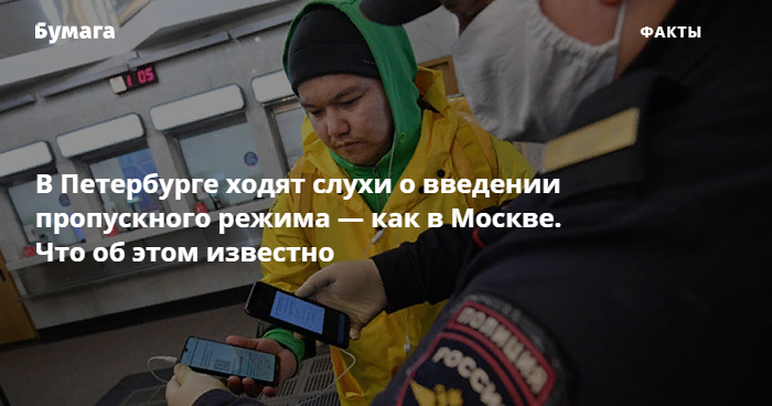«Новая газета» со ссылкой на источники в Смольном также пишет, что о введении пропускного режима в Петербурге планировали объявить 20 апреля, а с 22 числа он якобы должен был действовать. В комитете по транспорту «Бумаге» рассказали, что пока никакой информации о введении пропусков не поступало.