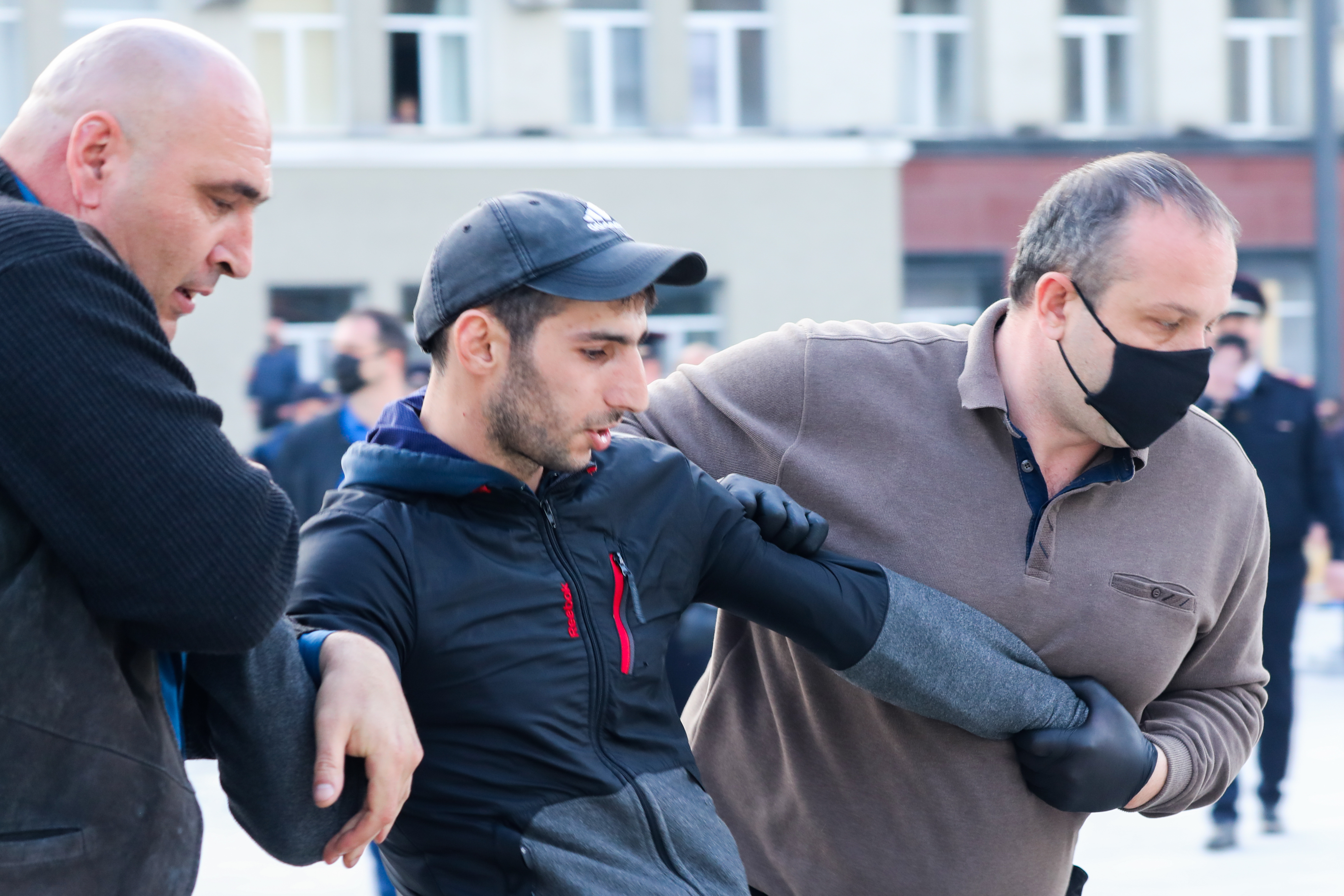 Около шести вечера ОМОН вытеснил с площади митингующих. министр внутренних дел республики Михаил Скоков, используя мегафон, отдал приказ не использовать спецсредства. В отношении тех, кто оказывал сопротивление, шли в ход дубинки. Но толпа была активнее и забрасывала силовиков камнями. В итоге силовики все же разогнали людей. Были и задержания. Официальных данных о них пока нет, но источники "Кавказ.Реалии" в правоохранительных органах рассказали, что задержаны как минимум 65 человек. Также сообщается о двух пострадавших силовиках.