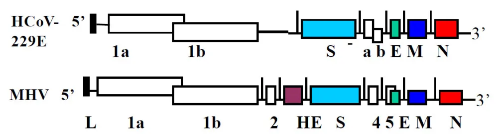 В структуре генома альфа-коронавируса человека 229Е и бета-коронавируса гепатита мышей (рис. 2) можно увидеть два очень больших белка: 1a и 1b [2]. Это РНК-полимеразы вируса с двумя разными функциями. Одна из них имеет прямое отношение к размножению вирусов, поскольку размножает вирусную рибонуклеиновую кислоту. Вторая полимераза синтезирует матричную РНК на различных участках генома, чтобы потом на их матрицах рибосомы синтезировали вирусные белки.