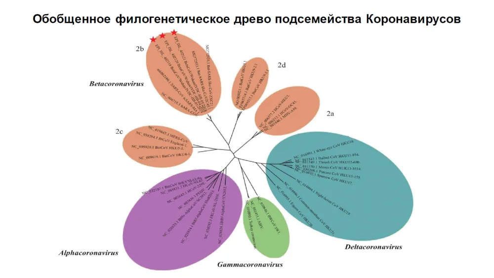 На рис. 4 изображено обобщенное филогенетическое древо подсемейства коронавирусов. Разными цветами обозначены разные роды. Нынешний вирус SARS-CoV-2 относится к роду бета-коронавирусов. Звездочками обозначены современные изоляты, которые были выделены во время нынешней эпидемии. В той же ветке — изоляты вируса атипичной пневмонии (TOPC-коронавируса), но они не особо близки нынешнему коронавирусу — всего около 80% идентичных нуклеотидов; а изоляты верблюжьего коронавируса — в принципиально другой ветви — слева, 2с. Видно, что последние весьма далеки эволюционно от нынешнего коронавируса.