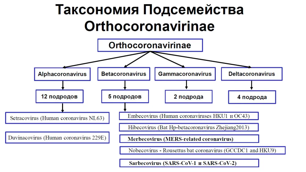Семейство коронавирусов состоит из двух подсемейств, и только к одному из них, Orthocoronavirinae, относятся собственно коронавирусы (рис. 3). Это подсемейство состоит из четырех родов: альфа, бета, гамма, дельта, а каждый из родов имеет еще и подроды. Нас интересуют только два рода: это Alphacoronavirus и Betacoronavirus. В род альфа-коронавирусов входят два коронавируса человека, которые вызывают обычные простудные заболевания и известны еще с 1960-х годов. К бета-коронавирусам относятся два обычных коронавируса человека и, кроме того, те три разновидности коронавирусов, которые вызывали эпидемии в мире в течение последних 20 лет.