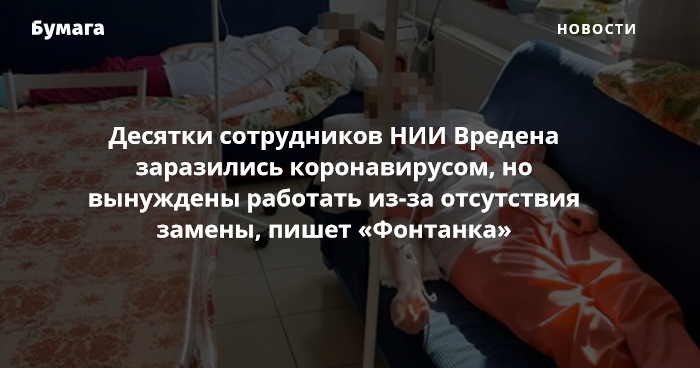 При этом многие сотрудники НИИ вынуждены продолжать работу, потому что их некем заменить, пишет «Фонтанка». Как изданию рассказала родственница одной из медсестер, они «держатся из последних сил» и в перерывах ставят себе капельницы.