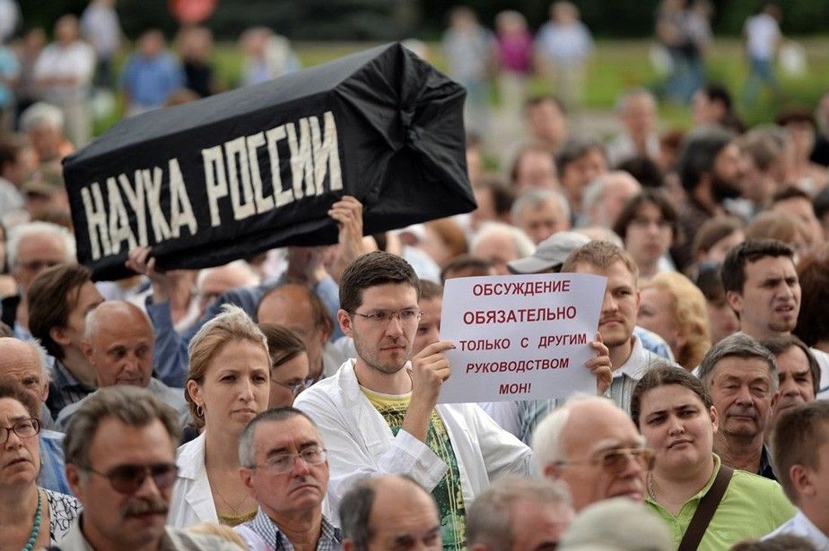 Летом 2013 года по Ленинскому проспекту в Москве, где стоит здание президиума Российской академии наук (РАН), пронесли черный гроб. На гробе было написано «наука России». Так ученые протестовали против реформы РАН, проект которой был спешно внесен правительством в Госдуму, а вскоре принят. В результате научные институты страны с их деньгами и недвижимостью оказались подчинены не Академии, а правительству. Те события тогдашние чиновники министерства образования теперь честно называют «спецоперацией».