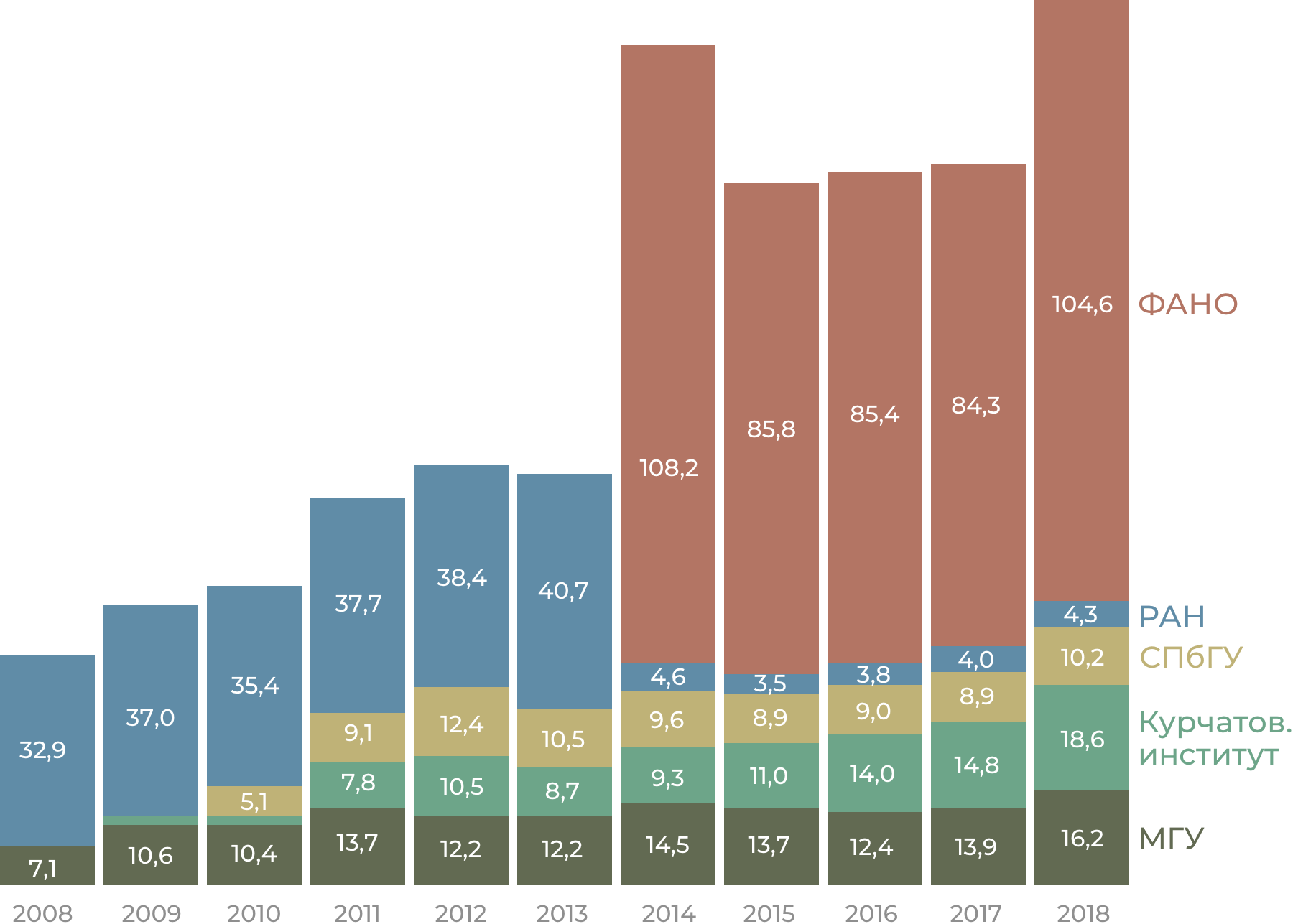 Источник: сайт Казначейства. Для всех организаций брались суммы исполненного бюджета. Для ФАНО в 2018 году такого показателя не было, поэтому в диаграмме указаны бюджетные ассигнования, утвержденные ФЗ о федеральном бюджете