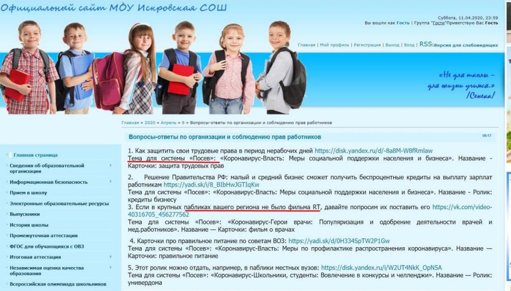 На сайте Искровской школы Саратовской области вместе с этими роликами предлагалось разместить и видео RT «Борьба с коронавирусом в России. Коммунарка и Денис Проценко». Сейчас сообщение уже удалено, копия осталась в веб-архиве.