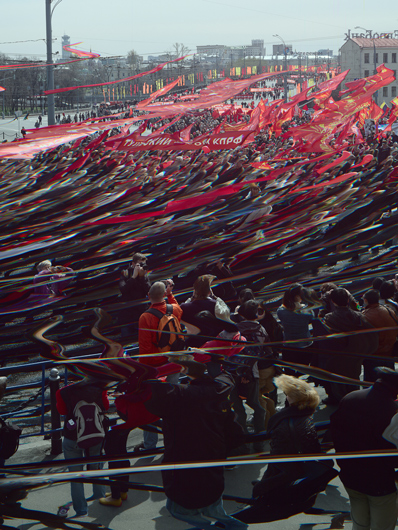 Никита Шохов. File_131_May 1, Moscow, 2013. Из серии «Scan» Это не новость, но у Шохова/Евтюгиной мы видим постмедийное, поствидеоигровое документальное изображение: нас учили, что приливы и отливы человеческих масс подчинены социальным законам, — а здесь это законы вычислительных функций. Ну, если грубо, так мог бы видеть массы людей приблизившийся к осознанию самого себя искусственный интеллект (напоминаю, что в современном мире это не какой-то там суперкомпьютер, а самообучающаяся программа, распознающая, трактующая и преобразующая образы). Изображение может спрессовываться в скульптуры, люди вдруг становятся плоскостными метками на трехмерной местности. Неузнаваемость конкретной ситуации приводит к обостренному эффекту узнавания сразу всех подобных ситуаций и себя в них.