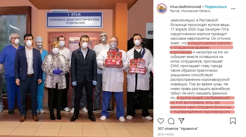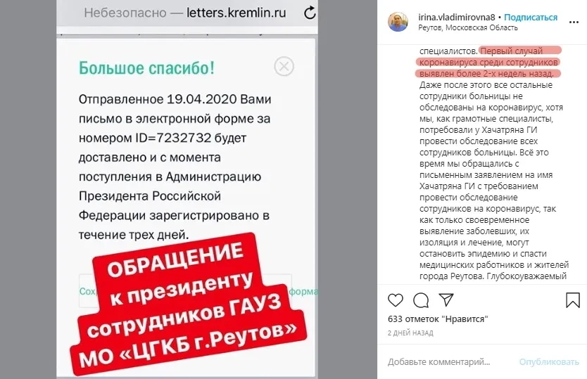 Обращение сотрудников реутовской горбольницы разместила на своей странице в Instagram заведующая отделением переливания крови Ирина Васькянина.