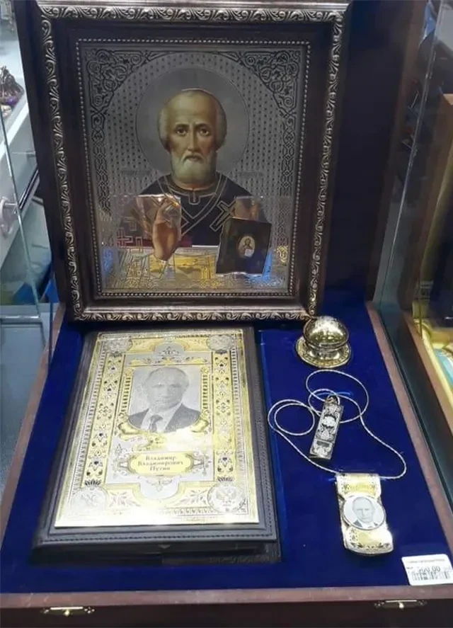 Потом появились иконы Путина в дорогом подарочном наборе в сувенирном магазине аэропорта Пулково. Там они шли в комплекте со святителем Николаем, весьма почитаемым православными. Песков тогда дежурно отреагировал, что Путин не особо одобряет подобные формы его почитания.