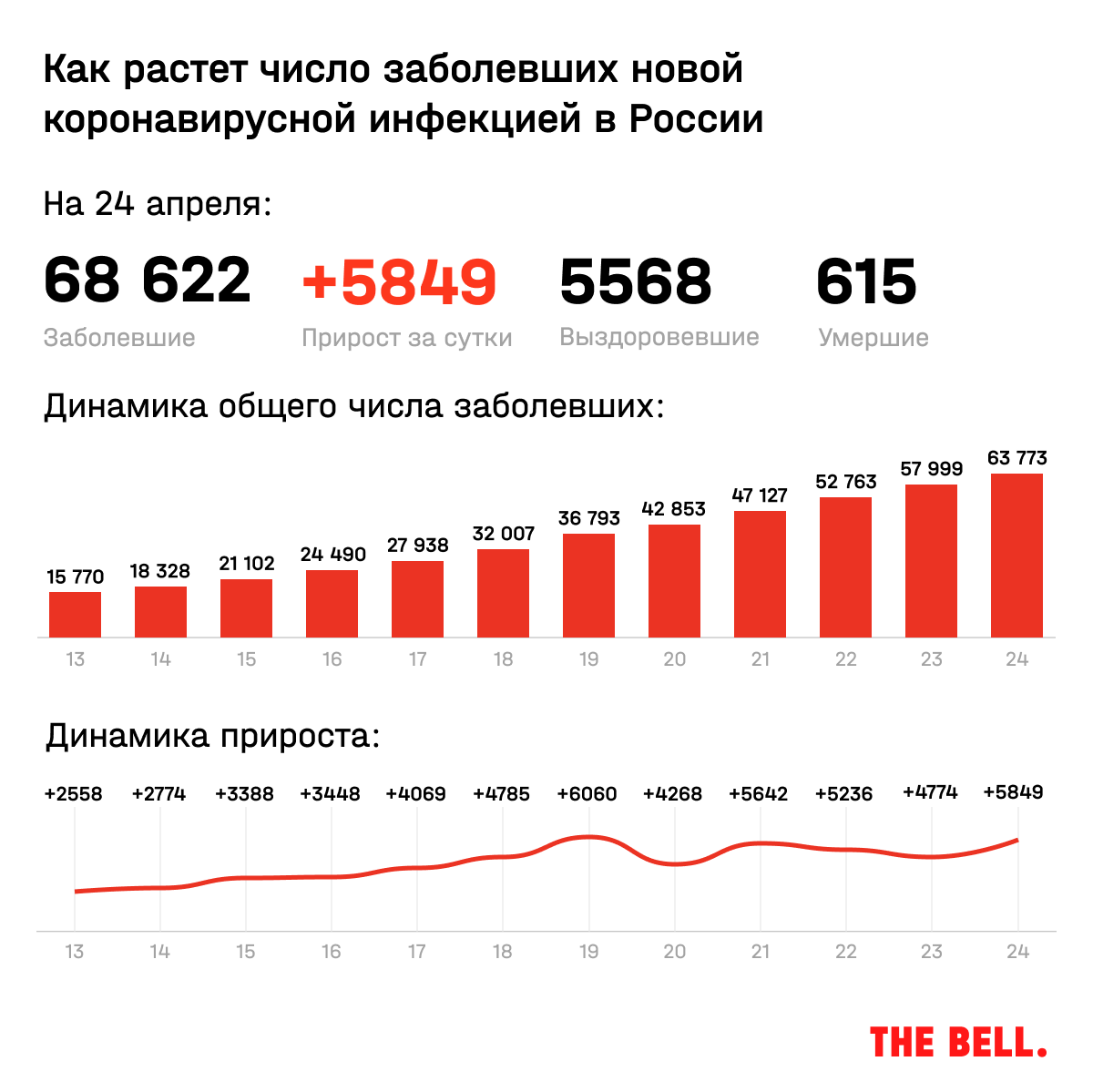 По данным оперштаба, в России за сутки на 24 апреля выявлено 5849 новых случаев коронавирусной инфекции против 4774 днем ранее. Всего в стране 68 622 случая.
