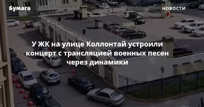 У ЖК «Темп» на улице Коллонтай в Петербурге 25 апреля устроили концерт с песнями военных лет — он начался в 11 утра. Об этом «Бумаге» сообщила местная жительница.