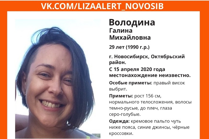 29-летняя Галина Володина пропала в Октябрьском районе Новосибирске, сообщили волонтеры «Лизы Алерт» 25 апреля. Известно, что 15 апреля около 22:00 она вышла из дома по улице Бориса Богаткова.