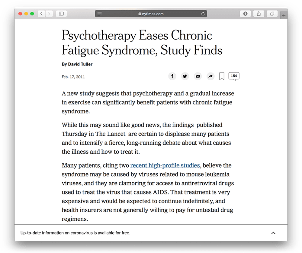 В 2011 году журналист и старший научный сотрудник в Университете Беркли Дэвид Таллер потратил пару часов, чтобы ознакомиться с PACE для короткой заметки в The New York Times. Не то чтобы Таллер специализировался на СХУ/МЭ — миалгическим энцефаломиелитом с начала девяностых болел его близкий друг, но сам Дэвид, как он вспоминает, об этом заболевании знал немного. В New York Times он писал о медицине и по долгу службы следил за всем, что становилось предметом врачебных дискуссий.