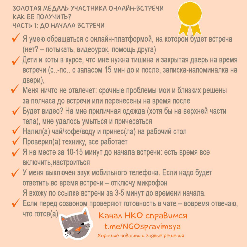 Избежать этих проблем можно, если участники будут заранее подготовлены. Поэтому задача организации, которая проводит встречу в Zoom, позаботиться о том, чтобы приглашенные получили всю необходимую техническую и практическую информацию по мероприятию и программе. Например, можно раздать им чек-листы, которые подготовила команда фонда «Добрый город Петербург» для дистанционного курса «НКО – удаленка без боли». На курсе специалисты расскажут, как сделать эффективной работу НКО в удаленном режиме. Обучение проходит до 4 мая 2020 года. Зарегистрироваться для участия можно по ссылке.