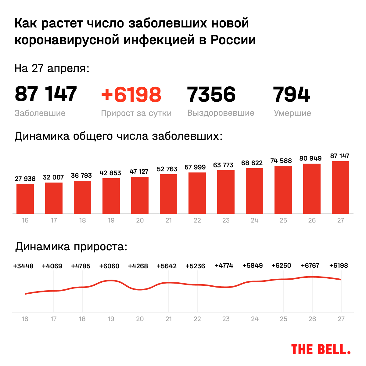 Число новых заболевших в России снова не выросло, но принципиально и не уменьшилось — за прошедшие сутки выявлено 6198 заразившихся COVID-19, почти на 600 человек меньше, чем в воскресенье. Зато у россиян появилась первая ориентировочная дата возможного смягчения карантина — 12 мая. Глава Роспотребнадзора Анна Попова заявила, что пока режим карантина следует продлить до этого дня — а дальнейшее будет зависеть от того, насколько россияне не «сорвутся» на праздниках.