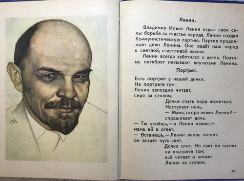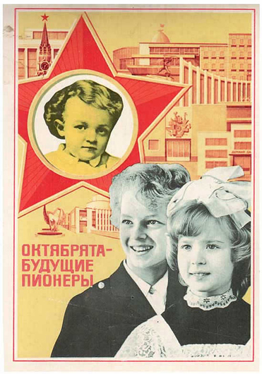 На сусально-официозные портреты Ленина рожденные в СССР смотрели всю свою жизнь, ежедневно и ежечасно. Более того, каждый советский человек годами носил изображение вождя на собственной груди. Инициация происходила в школе: каждому семилетке-первокласснику в рамках сакрализованного ритуала прикалывали на грудь значок — красную звездочку с портретом Ленина в виде кудрявого малыша [1] (неотчетливый субститут младенца Иисуса?). Каждый ребенок после обряда инициации становился «октябренком», то есть причащался святыне 1917 года. Более того, все октябрята именовались «внучата Ильича»… Подрастая через три года и вступая в пионерскую организацию, дети прикалывали на грудь новый значок — новый вариант пентаграммы с девизом «Всегда готов!» под экстатическим профилем вождя. На этом этапе инициация сопровождалась словами клятвы: «…жить, учиться и бороться, как завещал великий Ленин…»