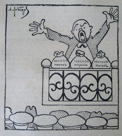 «Оратор на балконе». Август 1917 года. Художник А. Лебедев. Читатели могли мгновенно опознать Ленина на карикатурах, даже не зная, как он выглядит (или даже если в рисунках не было ни малейшего сходства с реальным обликом лидера большевиков). Устойчивыми аллегорическими маркерами Ленина были балкон, 30 сребреников, «пломба» с германским орлом, лысина, орущий рот. Кроме того, иногда маркером служил подчеркнуто заграничный костюм, а иногда — кепка