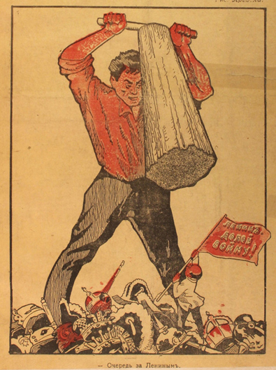 «Очередь за Лениным». Апрель 1917 года. Одна из самых ранних визуализаций вождя большевиков — поставленного на одну доску с представителями старого режима и атрибутами монархии, растоптанными восставшим народом