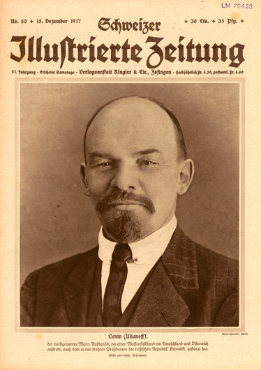 Фотопортрет Ленина на первой полосе Schweizer Illustrierte Zeitung. 15 декабря 1917 года. Фото сделано в Цюрихе годом ранее. Несмотря на некоторый «мефистофельский» вид, эта фотография не подверглась цензурным изъятиям в советские годы и неоднократно печаталась в официальных биографиях вождя