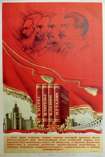 «…Есть одна отрасль науки, знание которой должно быть обязательным для большевиков всех отраслей науки, — это марксистско-ленинская наука…» Плакат. 1951. Художник В. Корецкий. Косноязычно-тавтологичный текст Сталина, ставший названием плаката, сегодня выглядит хармсианской пародией. Однако несколько поколений искало сакральные смыслы в каждой фразе четверки вождей, визуализированных на знамени. Последовательная редукция бороды у русской пары в сравнении с немецкими предтечами — возможно, тоже элемент «законов развития», о которых толкуется на плакате?