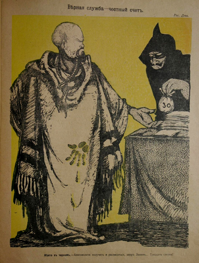 «Верная служба — честный счет». Июль 1917 года. Художник Дени (В. Денисов). Ленин в характерном иудейском балахоне с отпечатком кровавой руки и с петлей на шее — намек на бесславную и скорую смерть нового Иуды. Стоящий рядом «Некто в черном» — легко узнаваемый по усам кайзер Вильгельм — вручает предателю мешочек с тридцатью сребрениками