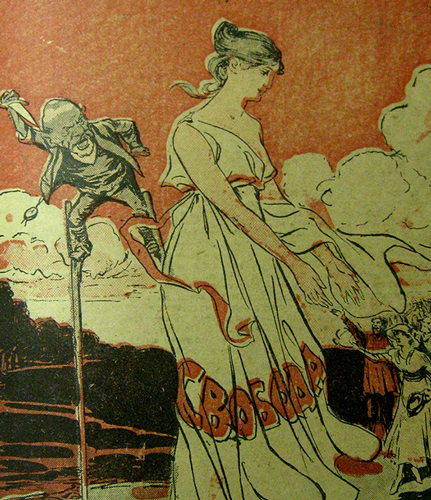 «Предательский удар в спину Русской Свободе». Июль 1917 года. Вооруженный ножом карлик — еще один частотный вариант ленинской иконографии 1917 года (здесь он вдобавок «пломбированный» и с раззявленным ртом). Персонификация России как юной девы-Свободы уже к концу лета сменится другой персонификацией — и вместо чистой Девы художники будут с горечью изображать Россию в образе грязной и спившейся бабищи * * *
