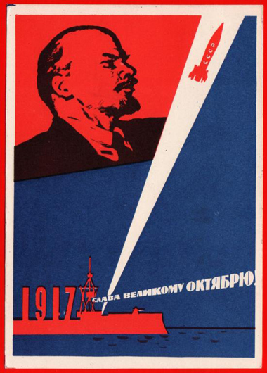 «Слава Великому Октябрю». Открытка. 1963. Художник М. Гордон. Вошедший в анналы выстрел «Авроры» (как известно — мифический) подан как точка отсчета новой космической эры — луч легендарного крейсера буквально высвечивает летящий космический корабль, запущенный провидческим течением мысли великого кормчего [1] Изображение на значке восходило к фотопортрету четырехлетнего Володи (1874). Металлический вариант звездочки октябренка содержал рельефное изображение этого портрета (в раннем варианте вокруг звезды шла надпись «Октябрята внучата Ильича»). К началу 1980-х появилась пластмассовая версия звездочки-значка, в центр которой была вмонтирована фоторепродукция 1874 года. Истоком этой иконографии стал живописный портрет кудрявого Володи Ульянова (хранится в ГИМе) художника И. Пархоменко (1920), созданный на основе указанного фотоснимка; вскоре с этого же изображения появились портрет работы И. Бродского, растиражированный на открытке (1924), и почтовая марка художника В. Куприянова (1927). Впоследствии этот образ тиражировался в самых разных трансформациях, среди которых уместно выделить скульптуру маленького Ильича, опирающегося на тумбочку со стопкой книжек (работа Т. Руденко-Щелкан 1936 года), а также скульптуру З. Баженовой, где мальчик идет с книжкой в руке (1940); обе эти скульптуры мультиплицировались в виде тысяч гипсовых и бронзовых копий по всей стране.