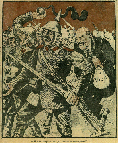 «А еще говорят, что “история — не повторяется!”». Сентябрь 1917 года. Художник Эспе. Ленин вновь с петлей Иуды на шее, прямо в рядах кайзеровских солдат, идущих в атаку на русские позиции. Портретное сходство исчерпывается лысиной и бородкой, а инфернальный оскал, крадущаяся поза и мешок все с теми же «30 сребрениками» усугубляют отвратительный облик предателя