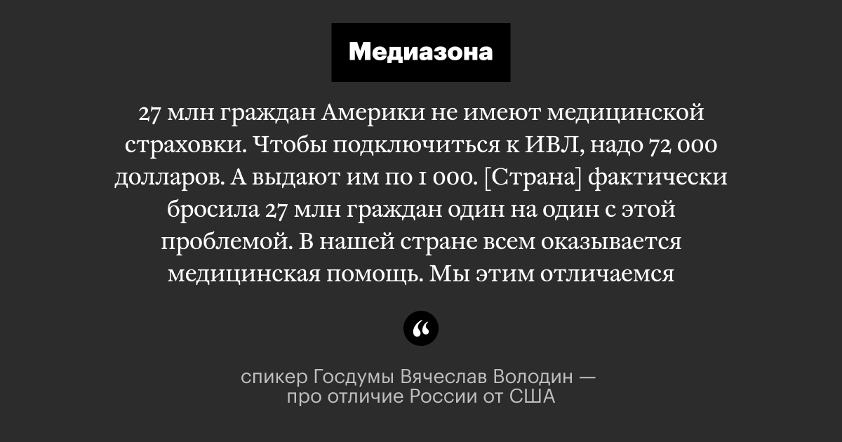 «27 миллионов граждан Америки не имеют медицинской страховки. А для того, чтобы подключиться к ИВЛ, надо 72 тысячи долларов. А выдают им по тысяче долларов. Вот вам, пожалуйста, действие этой страны, которая фактически бросила 27 миллионов граждан один на один с этой проблемой. В нашей стране всем оказывается медицинская помощь. Мы этим отличаемся», — сказал Володин.