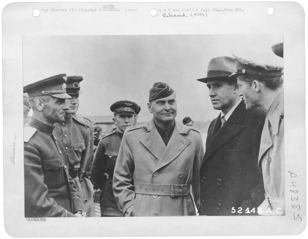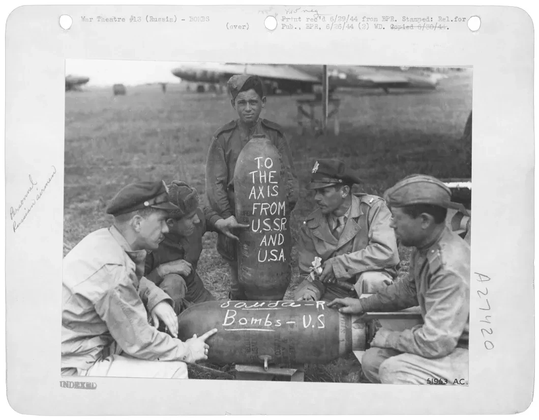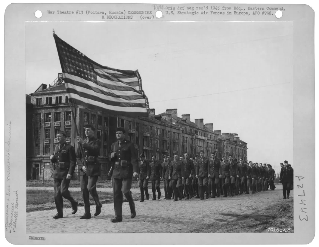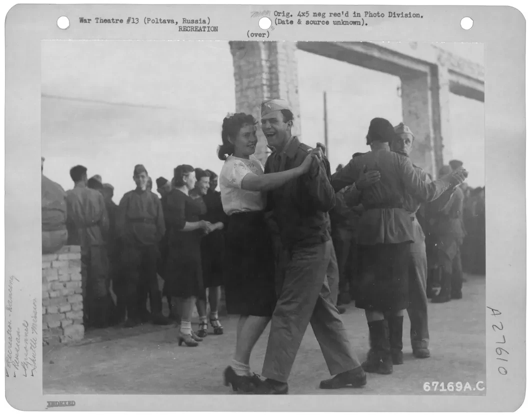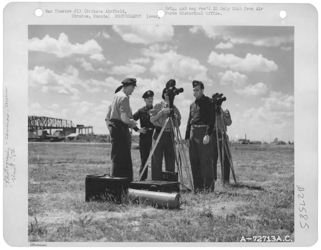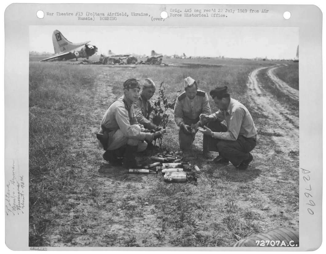 Повторюсь: копии снимков с указанием Poltava, Russia, иногда с именами авторов вроде «15-я воздушная армия США, 8-я боевая камера, сержант Р. Тири», вернулись на место съемки, в Украину, благодаря Олегу Безверхнему, вместе с той самой архивной лентой «Операция «Титаник». Фильм выпустили в прокат по ходу сверхсекретного «Фрэнтика», для маскировки сменив название. При обилии прессы на базе (советская была представлена «Правдой», «Известиями», «Красной звездой», «Радянською Україною», информационными агентствами, список неполный) эта мера предосторожности выглядела не слишком-то надежной. Впрочем, маскировочная фигура речи «Где-то в России», что звучала в фильме, рассчитанном на американскую аудиторию, имела подтекст: не подумайте, что мы вдруг прониклись симпатией к коммунистам и государству СССР,