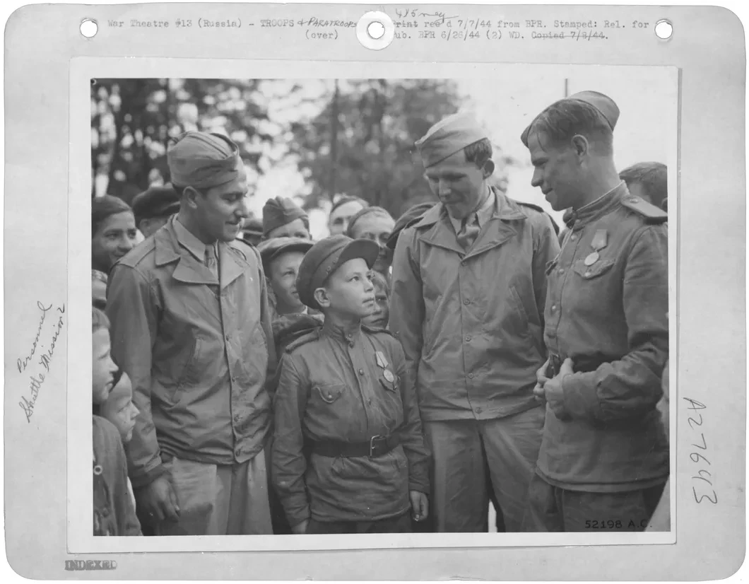 О самом известном снимке такого рода я расспросила, кажется, всех знакомых украинских историков, и безуспешно. «Боевая камера» сделала пометку на полях фото: группа в составе сержанта Вайншенкера, техника-сержанта Топпса и т.п. и «сын полка» 169-й авиабазы, помощник авиационного техника, 10 лет. Фамилия не указана. Наверное, оказалась слишком трудной для воспроизведения. На груди ребенка, на левой стороне гимнастерки хорошо видна медаль «За отвагу», самая почетная у фронтовиков.