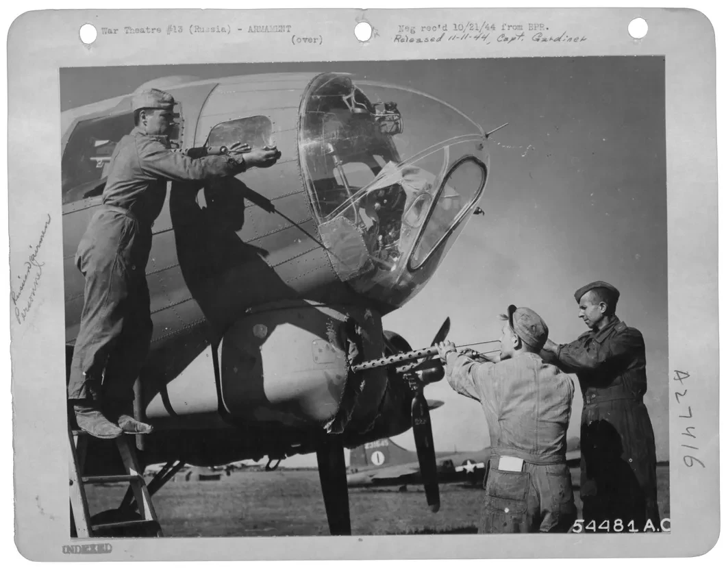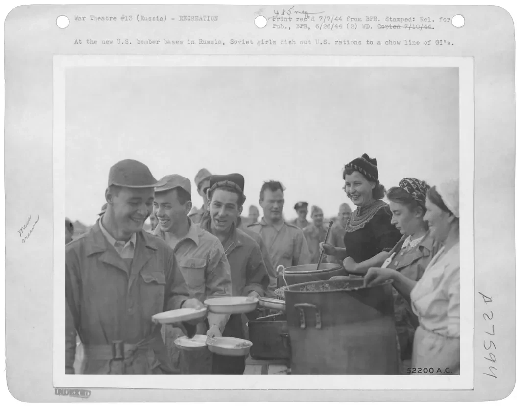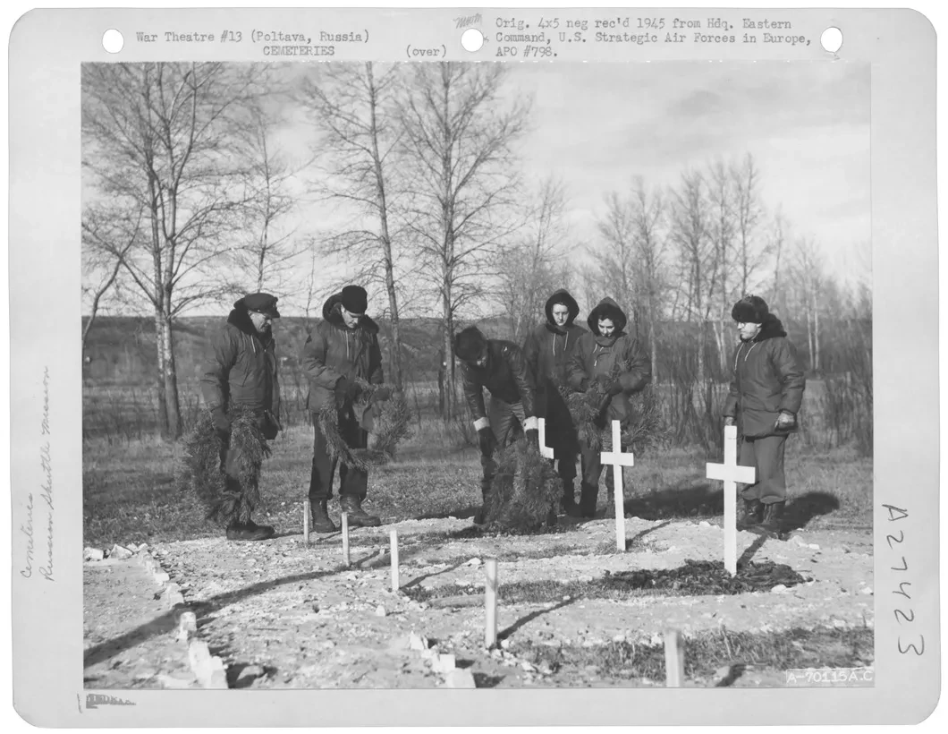 Украинская Полтава подошла идеально. Разбитое воронками от взрывов летное поле отвергли — нужен не ремонт, а строительство нового аэродрома. Для вспомогательных выбрали соседние Миргород и Пирятин. Запчасти к самолетам, джипы, материалы — одних стальных плит для покрытия взлетно-посадочных полос 12 000 тонн! — доставляли из Штатов конвоями по морю до Мурманска, дальше посуху, литерными поездами. Конкурс на 1400 рабочих мест, включая грузчиков, выиграли местные женщины разного возраста. Дети, старики или инвалиды, вернувшиеся с войны, так вкалывать не могли, а других рук город не имел.