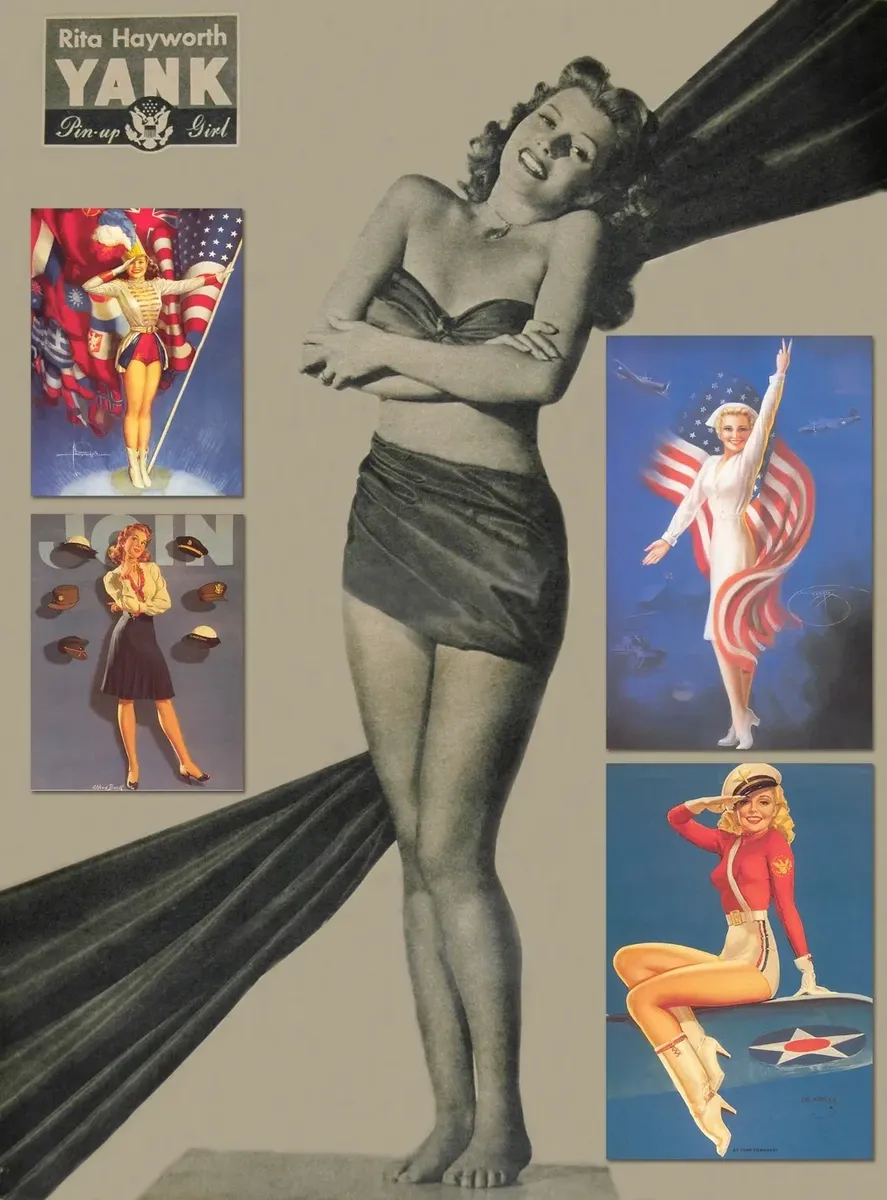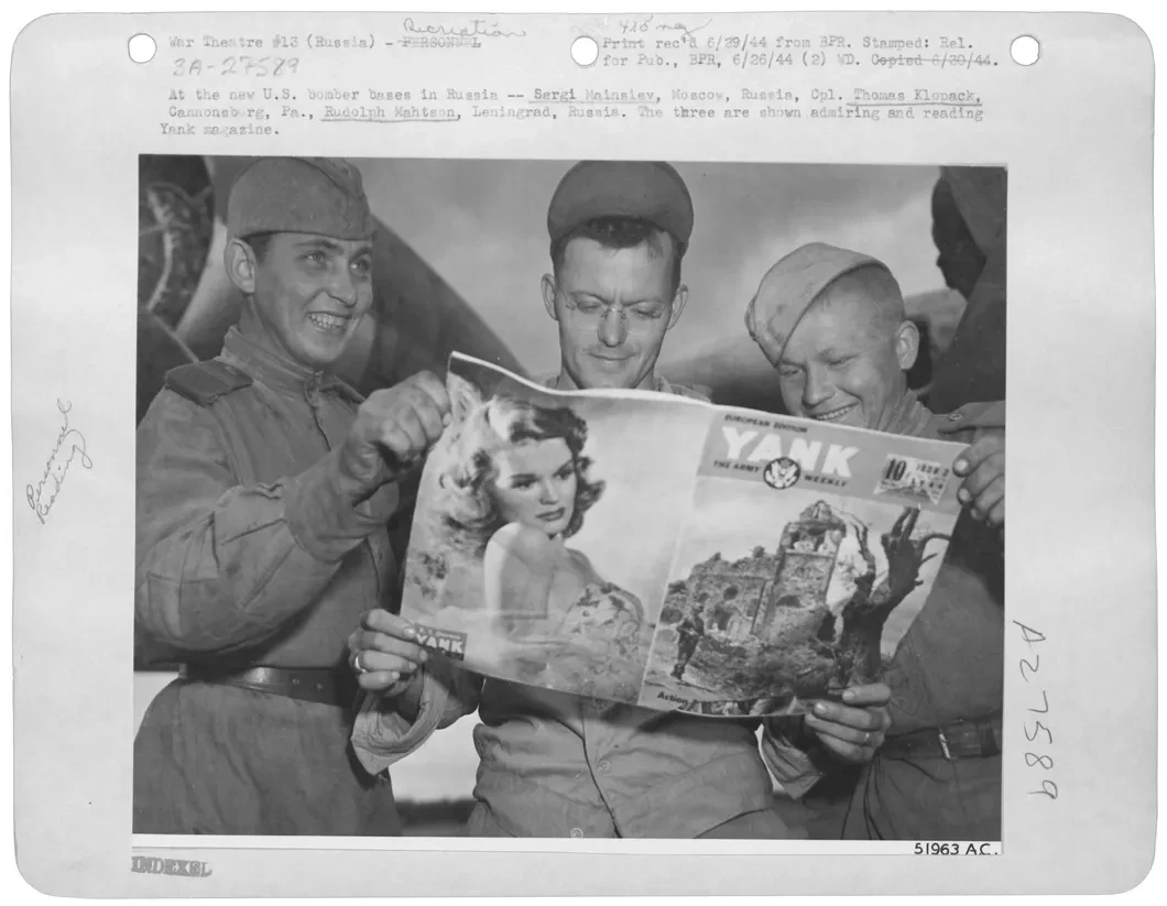 Бойцы вместе листают журнал Yank с Ритой Хейворт на обложке.