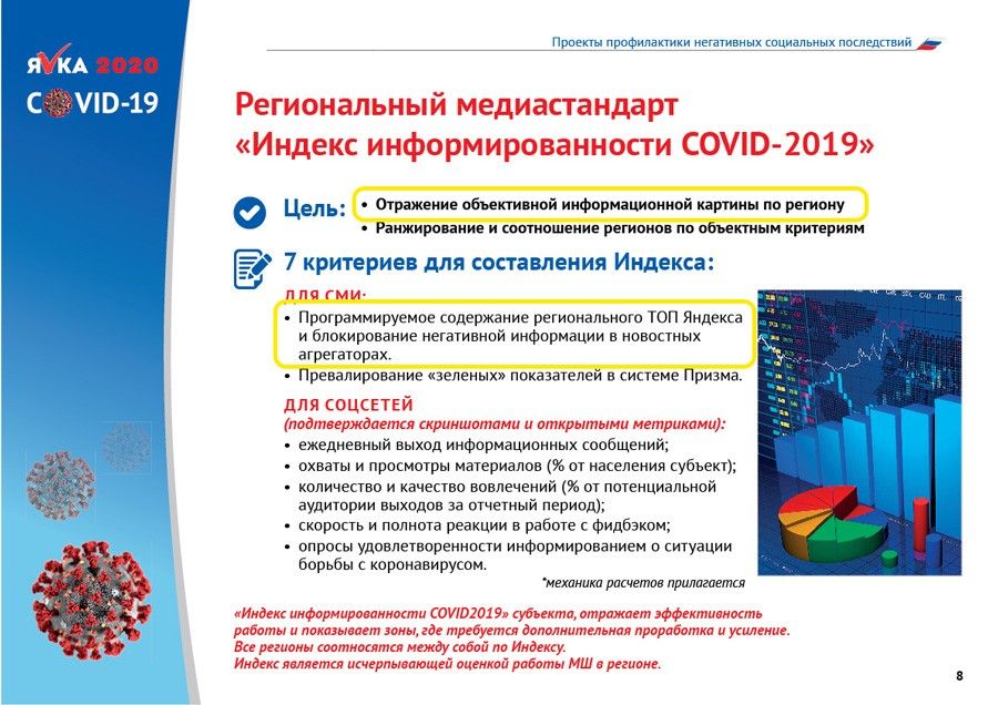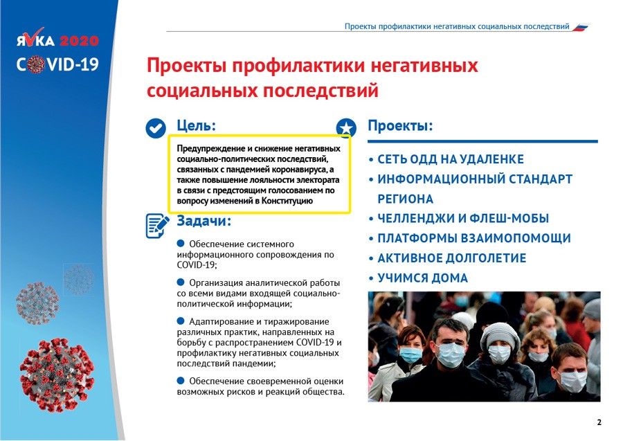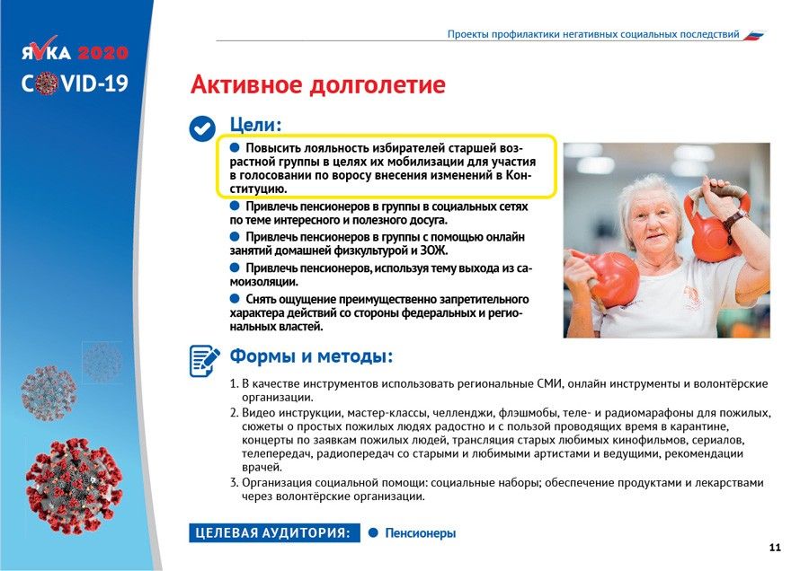 В разгар эпидемии региональные власти стали получать из Москвы документ под названием «Пандемия коронавируса COVID-19» . Документ есть в распоряжении «Проекта», фрагменты этого документа публиковали telegram-каналы. Несмотря на название он не имел никакого отношения к борьбе с вирусом. Его написали подчиненные Кириенко чиновники , говорит собеседник в одном из регионов и подтверждает источник в руководстве «Единой России», а его цель — повысить лояльность электората перед голосованием по изменению Конституции.