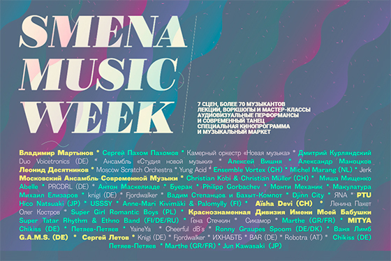 В течение недели организаторы Smena Music Week предложат слушателям музыку самых разных жанров и направлений — от академического авангарда и современного джаза до хип-хопа и андеграундного техно.