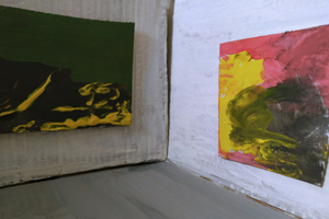 Например, открыть филиал. Пришлось взять коробку от утюга — знаете, это еще хорошо, что я ее не выбросила после покупки. Хотя, если вдуматься, зачем мне утюг: я ведь теперь никуда не хожу. Коробку пришлось немного переоборудовать, чтобы получился зал с оптимальным объемом выставочного пространства, покрасить стены и пол гуашью. Жаль, в нашей настоящей галерее нельзя покрасить пол, он мраморный.