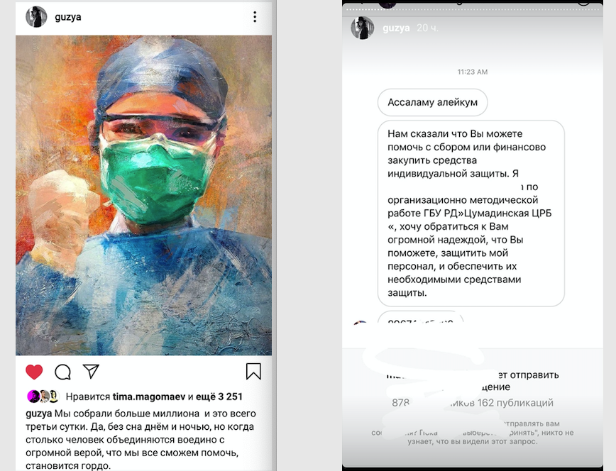 "Запросов крайне много. Конечно, полностью закрыть нужду мы не сможем, но постараемся не обделить никого. Сегодня важен каждый из вас. Для нас нет особых", – рассказывает в сториз блогер Гузель.