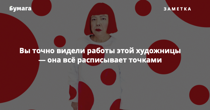 Один из таких фильмов — «Кусама. Бесконечные миры» (2018 год). Это документалка про Яёйе Кусаму — 91-летнюю японскую художницу, живую легенду арт-мира. Вы всегда узнаете работы Кусамы по многочисленным точечкам — ими она покрывает холсты, гигантские тыквы, надувные фаллосы и даже аксессуары в коллаборации с Louis Vuitton.