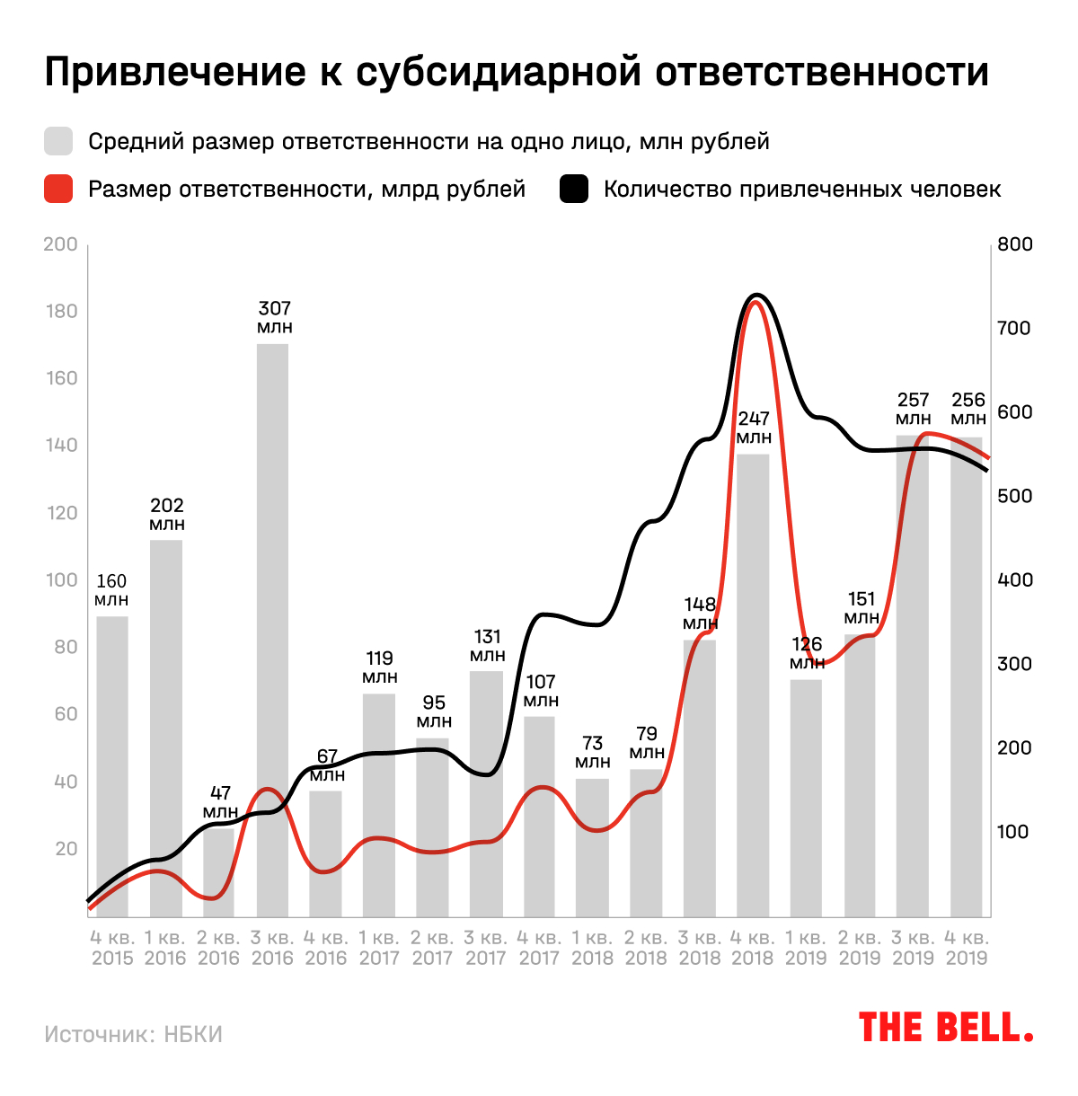 - За 2018–2019 годы банкротами стали 25,5 тысяч компаний, а к субсидиарной ответственности было привлечено 4,3 тысячи человек. Средняя взысканная таким образом сумма во второй половине 2019 года превышала 250 млн рублей. Ответственность часто распространяется не только на учредителей, но и на главного бухгалтера, финансового директора и других руководителей среднего звена.